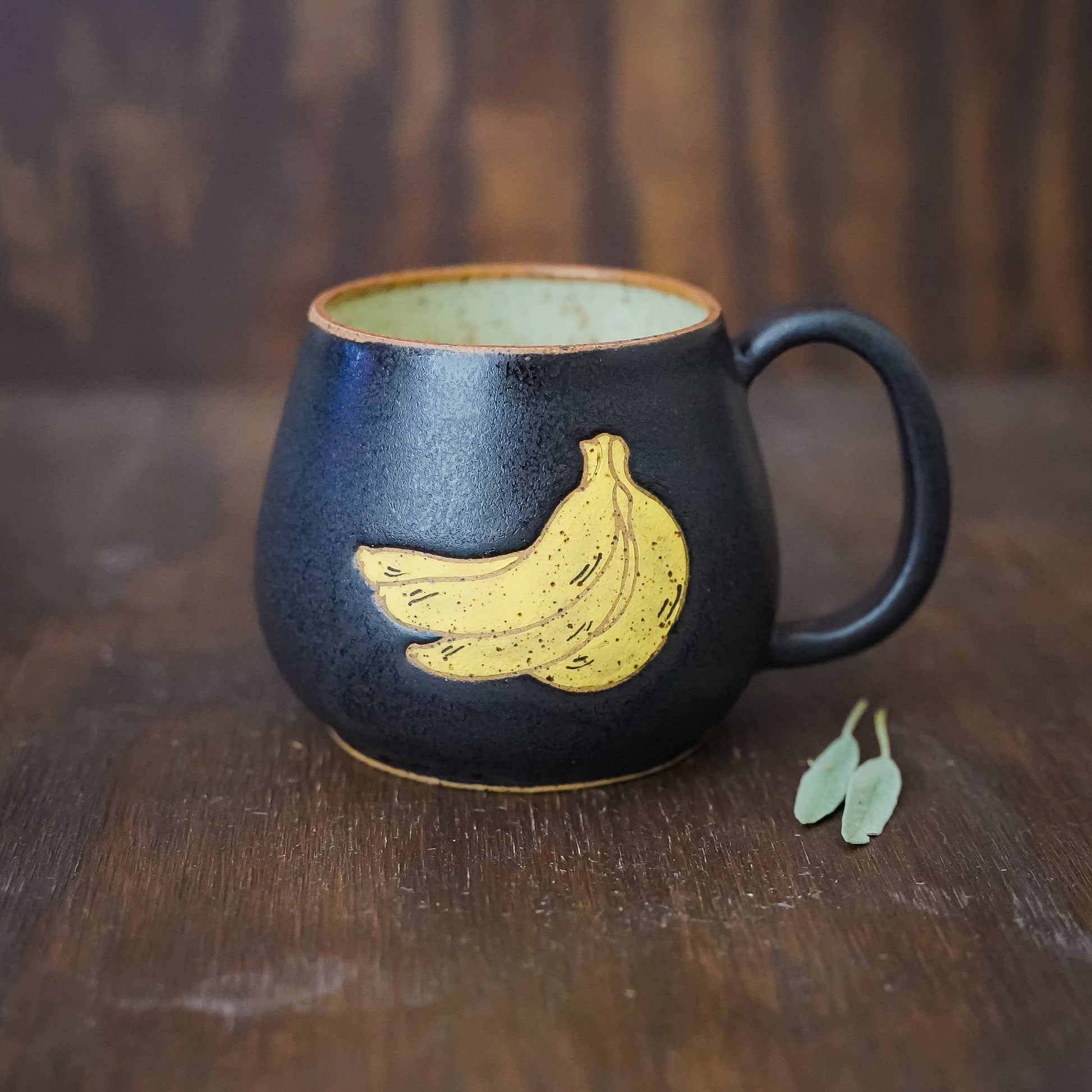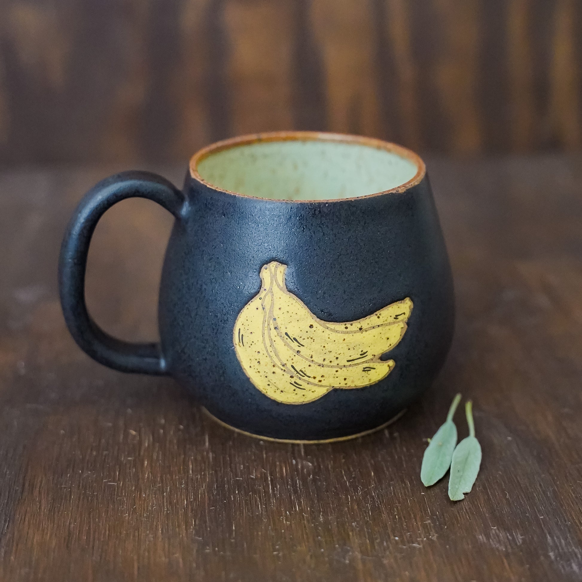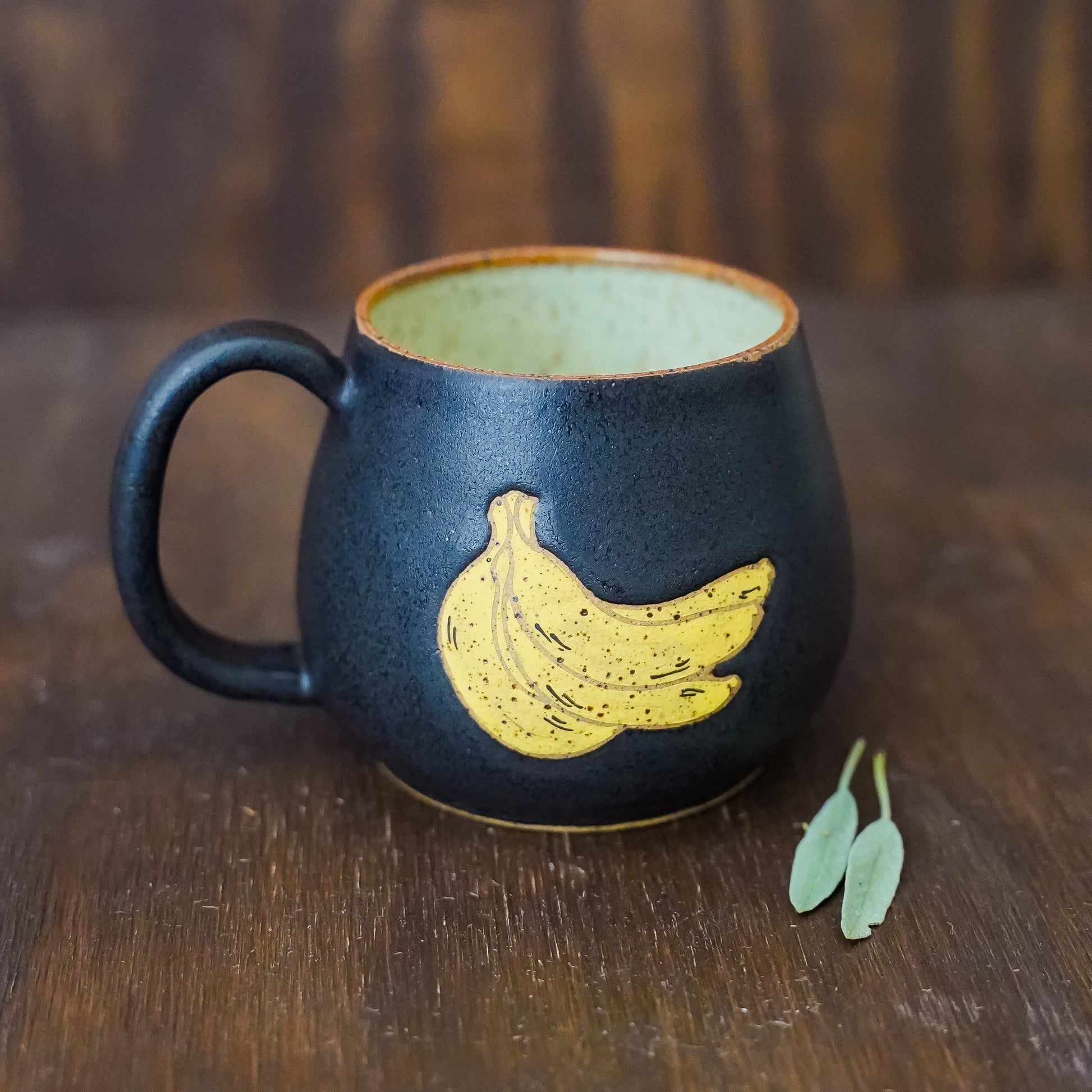 The It's banana mug is hand painted pottery. The mug is uniquely designed and the glaze makes the it's banana mug absolutely special and fun. The mug is approximately hold 16 oz of liquid and approximately 3 "(Rim), 5 " wide with handle and 3.5" tall.